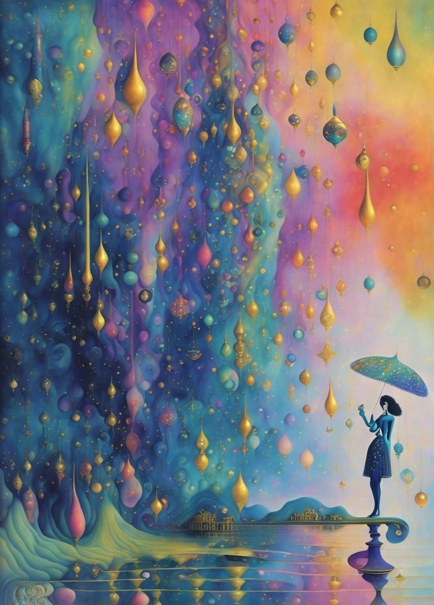 A surreal scene featuring a figure with an umbrella standing on water, surrounded by colorful, cascading shapes and floating ornaments against a vivid purple and pink backdrop.