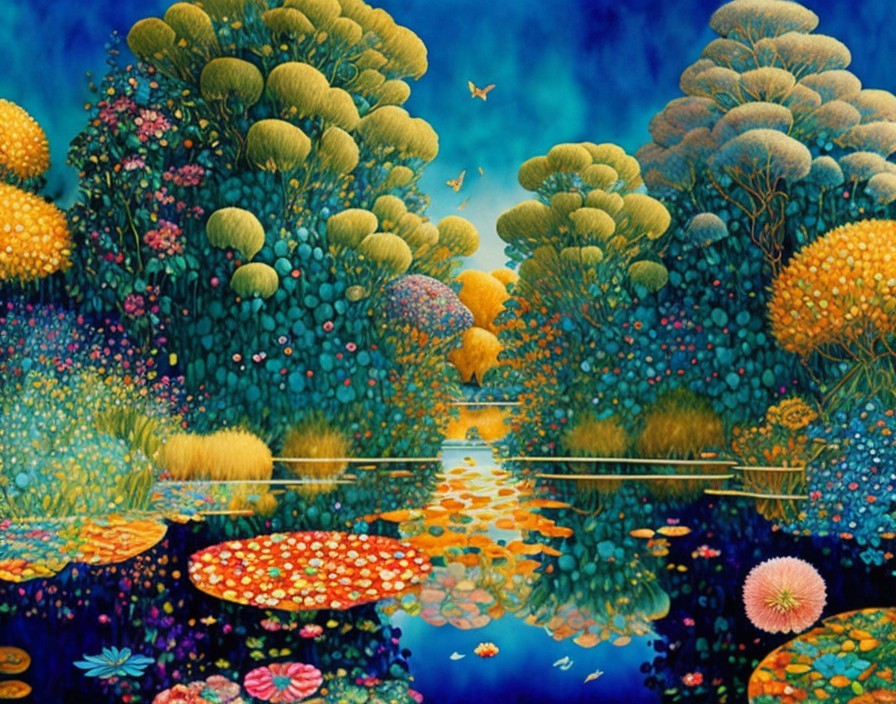 Full page, single image, 3D watercolor patchwork, in the very best style of Gustav Klimt of a pond reflecting a beautiful Tingatinga style garden with numerous flowers with vibrant spectacular colors, luxurious trees and plants with delicate leaves in shades of azure blue and teal and gold, golden sunrise rays shimmering over the scene, intricate, satiny, high quality, elegant, highly detailed, glistening magic style with elements in the style of Jan Toorop