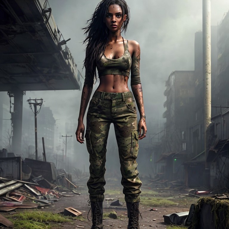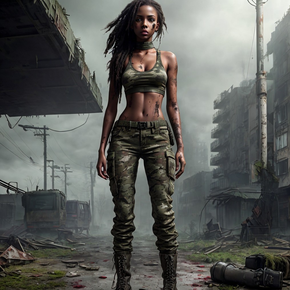 Prompt: "Camouflage-clad girl, youthful and striking, standing confidently, cropped top revealing navel, subtly exposed panties, baggy pants, sturdy boots, urban decay backdrop, moss-covered buildings, eerie blood splatters, lurking zombies, post-apocalyptic atmosphere, gritty and intense, detailed character design, realistic style with a touch of fantasy, dramatic lighting casting ominous shadows, artistically rendered, Artstation."