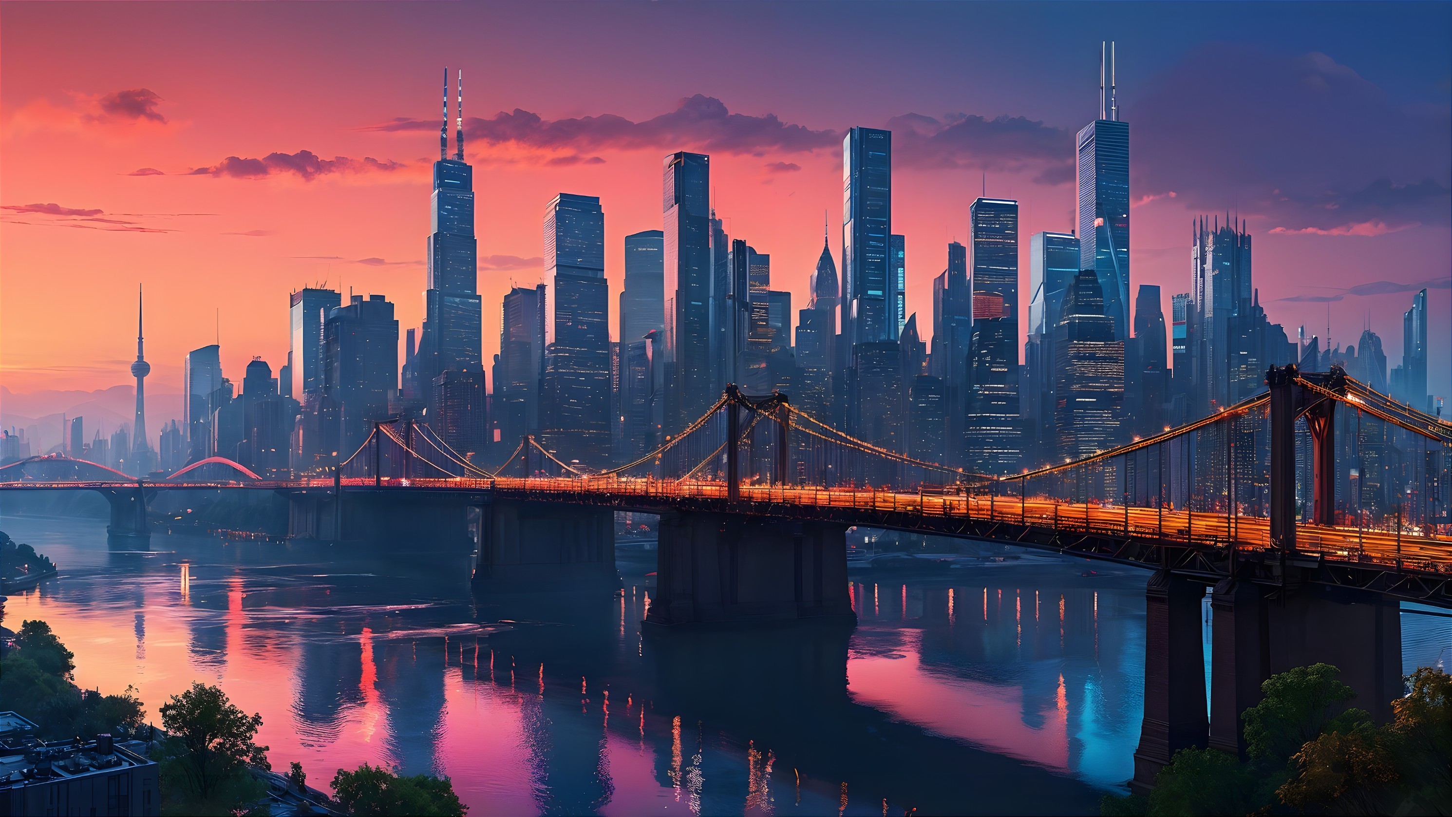 A stunning pre-dawn cityscape features a blend of towering high-rises and historic buildings, illuminated by natural sunlight. The vibrant colors and dramatic shadows create a hyperrealistic, surreal masterpiece.