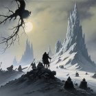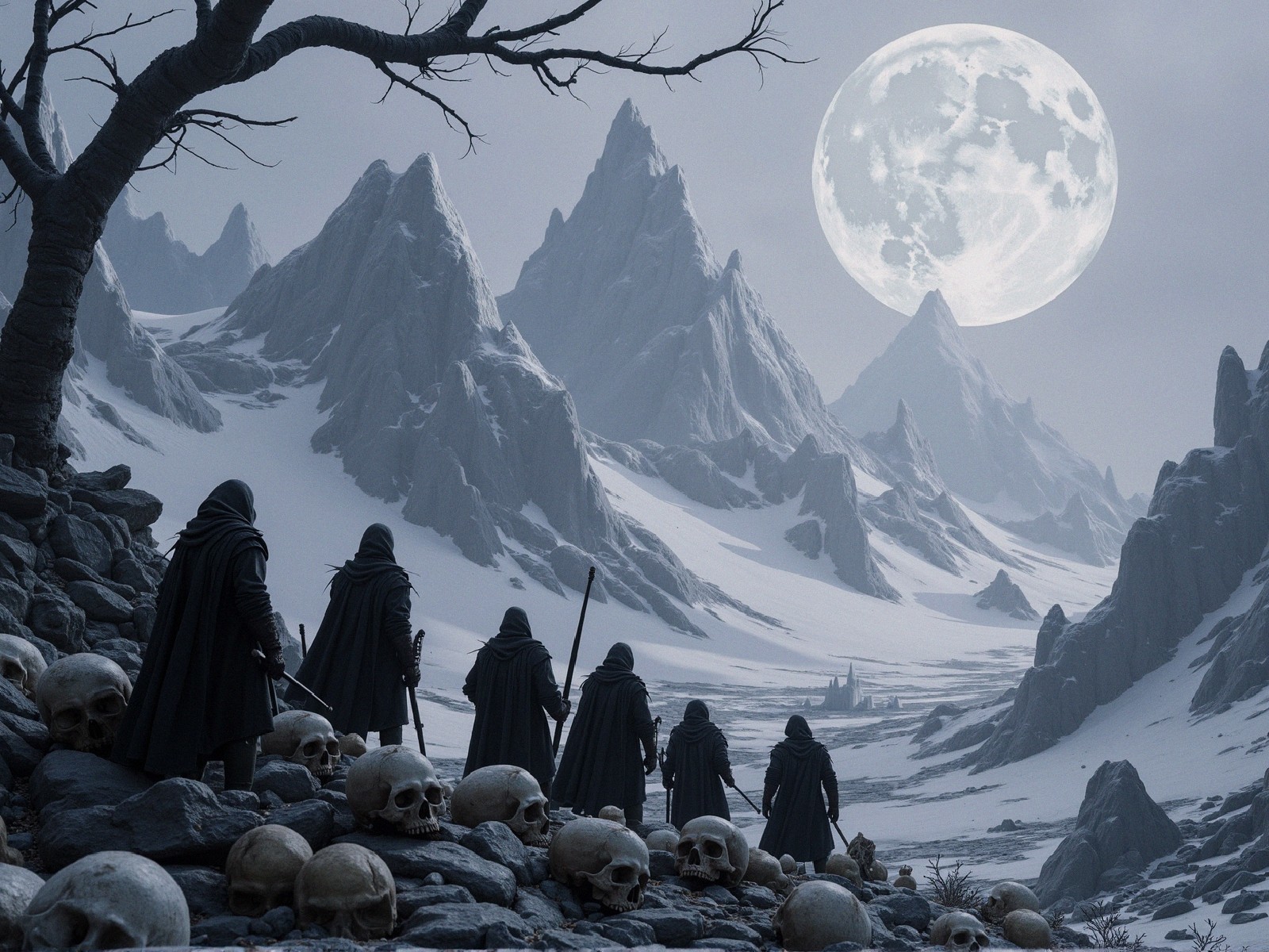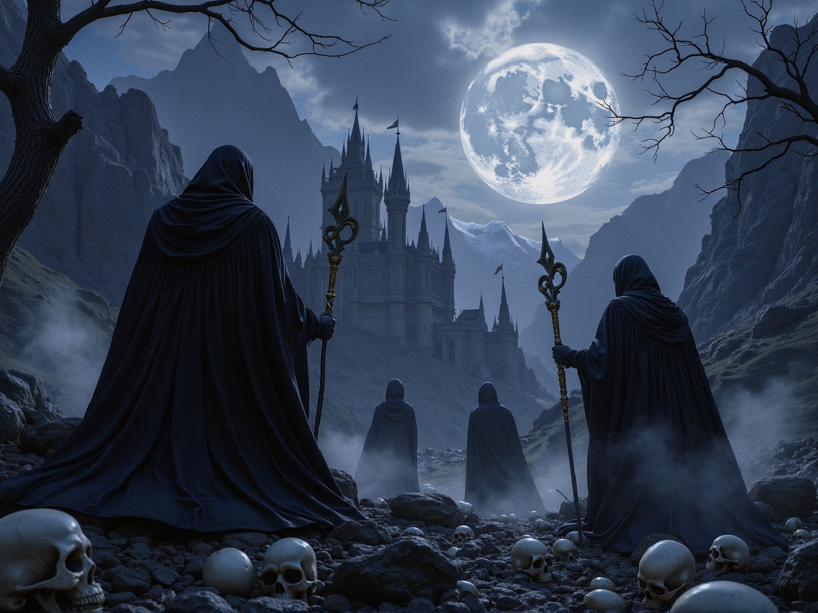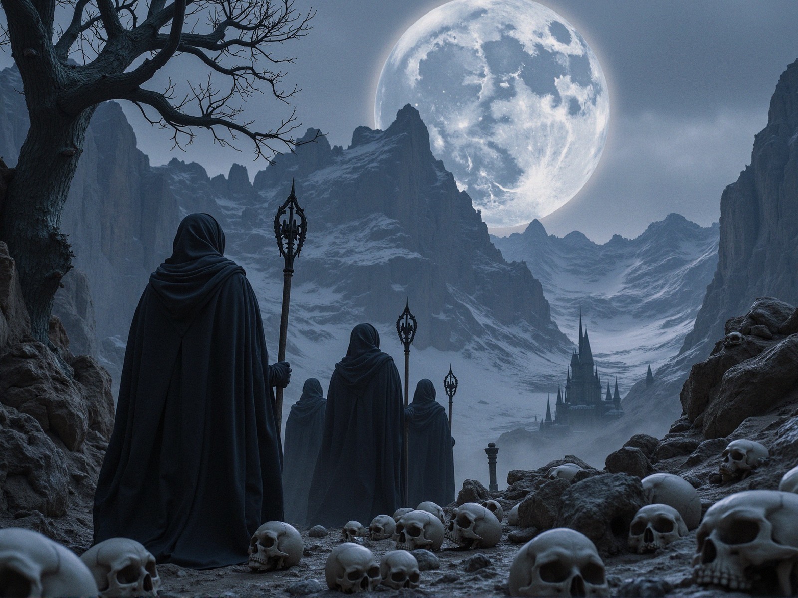 A dark, atmospheric scene features cloaked figures holding staffs, standing amidst a rocky landscape littered with skulls. A large full moon illuminates a distant, ominous castle where the Troll King is interred. On this unholy night he will rise.