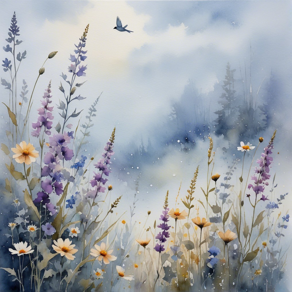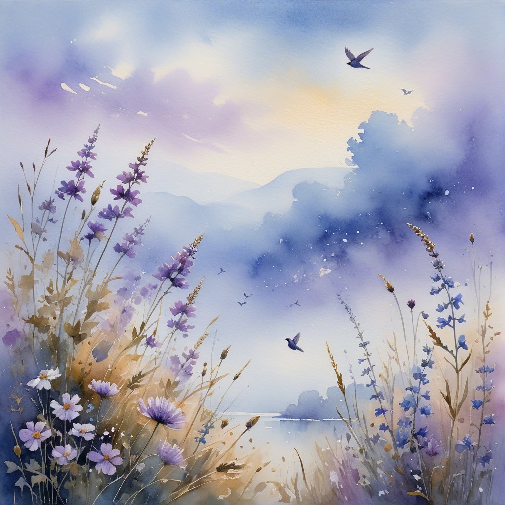 A serene landscape featuring vibrant wildflowers in purples and yellows, alongside a tranquil waterway, under a soft, dreamy sky with a bird soaring above. The scene evokes peace and beauty.