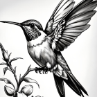 A beautifully detailed black-and-white illustration of a hummingbird in flight, accompanied by delicate flowers. The intricate design highlights the bird's vibrant features and graceful wings.