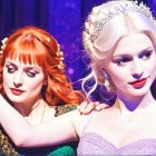 The image features two ethereal women with striking blue eyes, styled with intricate hairstyles. They are set against a vibrant, abstract purple background, giving a dreamy atmosphere.