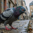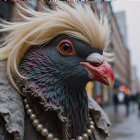 A stylish pigeon with a wild blonde wig and a pearl necklace struts confidently down a city street, surrounded by a bustling urban backdrop on a rainy day.