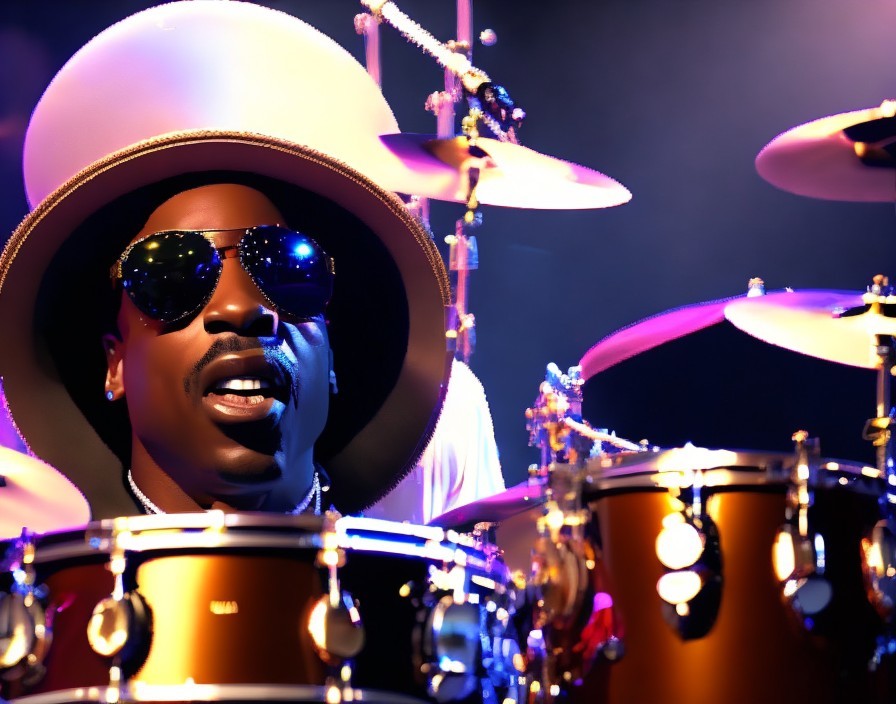 Smiling person in sunglasses and hat playing drum set with cymbals and percussion instruments