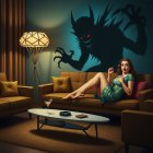 In a cozy living room, a woman sits on a couch, looking startled. Behind her, a menacing shadow with red eyes and claws looms on the wall, creating a chilling contrast to the warm setting.