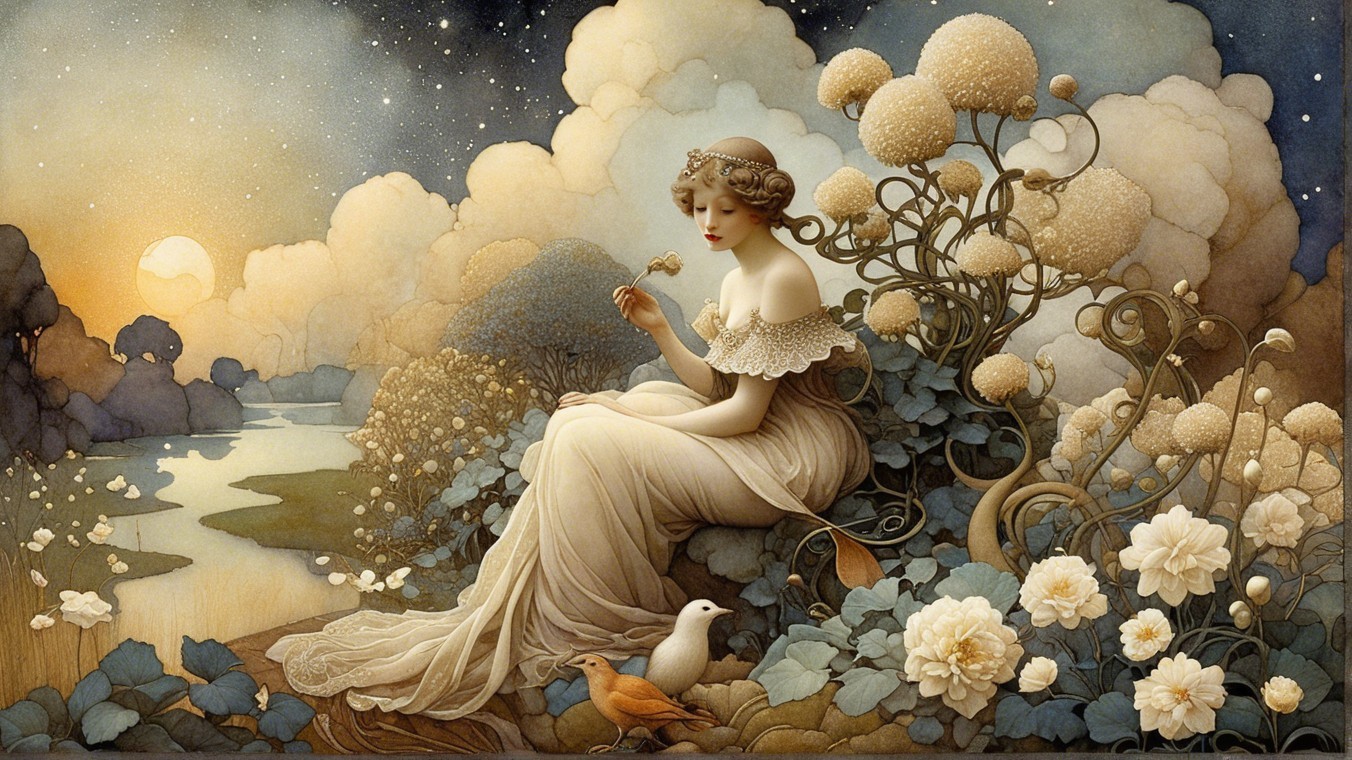 A serene woman with flowing hair adorned with flowers leans gracefully amidst pale blooms and swirling patterns, set against a dreamy backdrop of clouds and distant architecture.