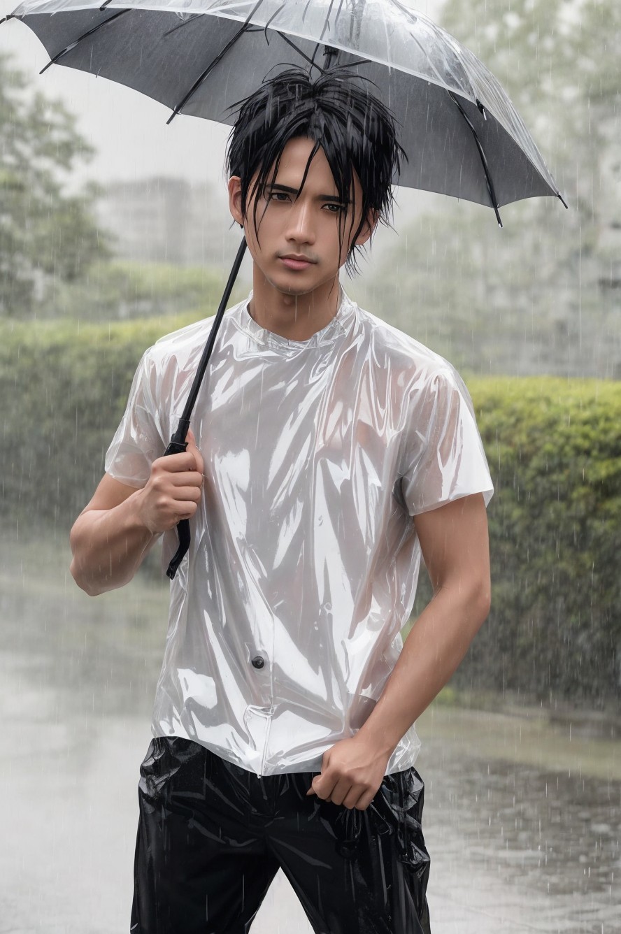 A full body shot of a young man with wet, dark, messy hair under a clear umbrella, looking directly at the viewer with a neutral expression. He is wearing a semi-transparent, shiny, crinkled white PVC t-shirt and black pants, standing in the rain with water streaks visible