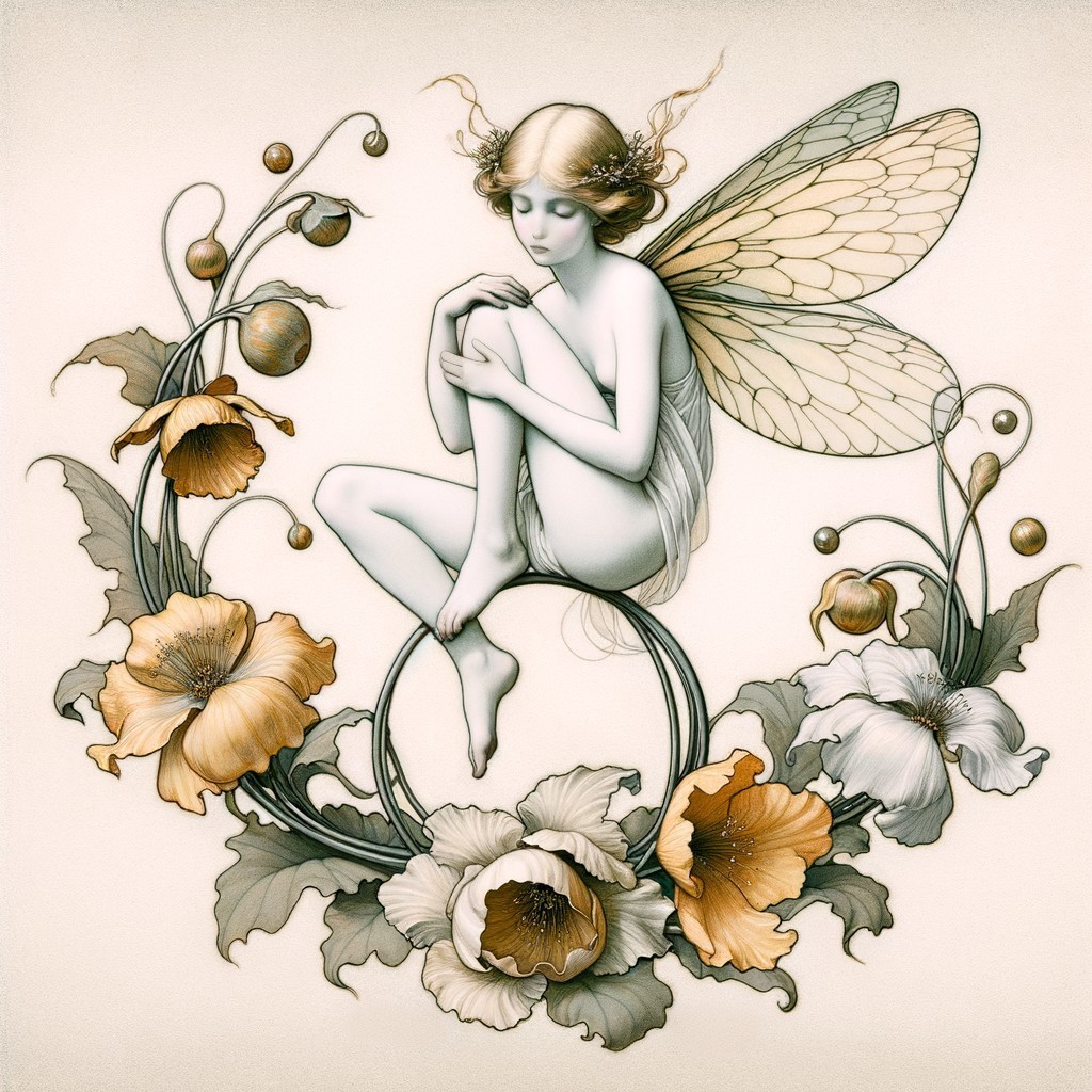 An illustration of a delicate fairy with butterfly wings, surrounded by intricate flowers, exuding an ethereal and whimsical charm.