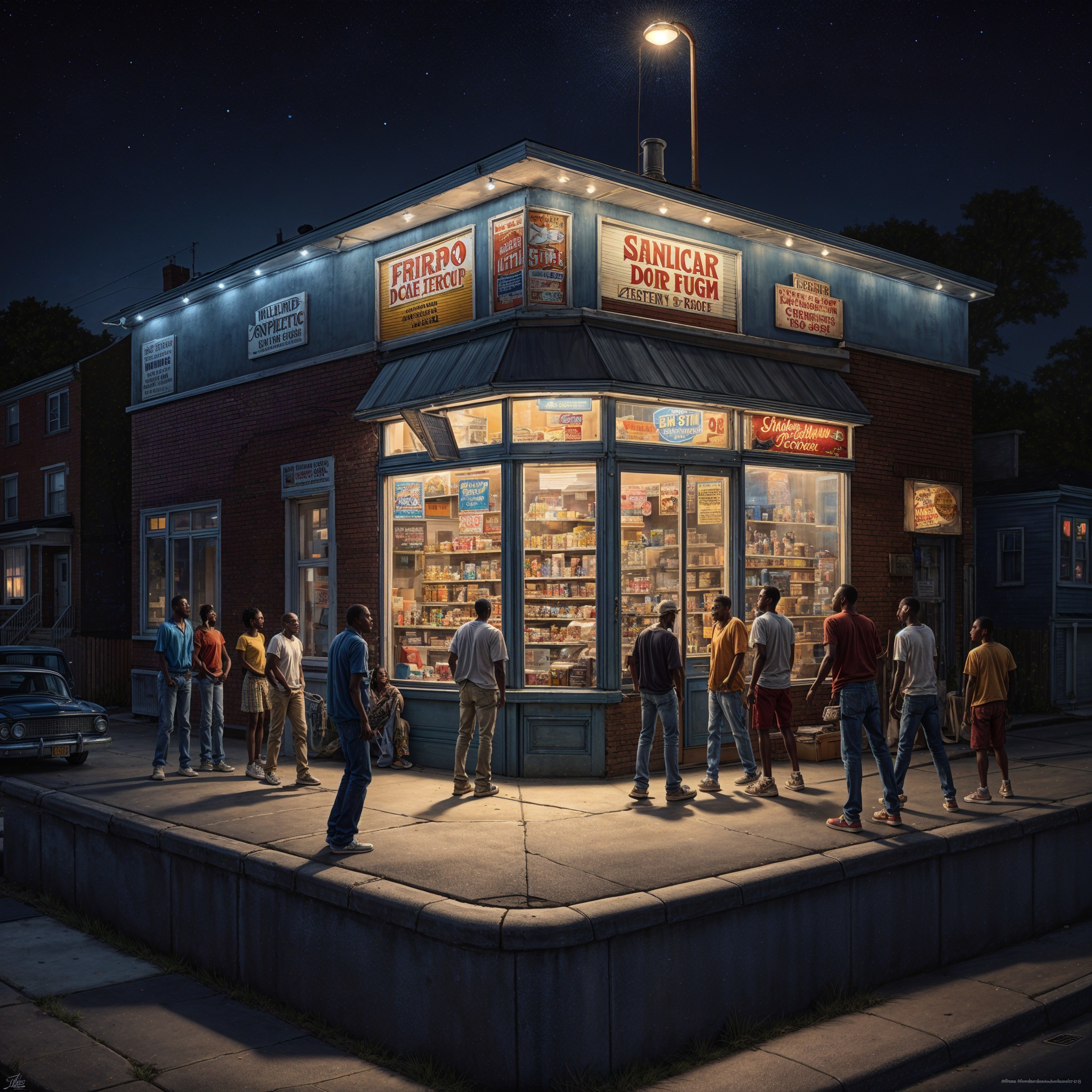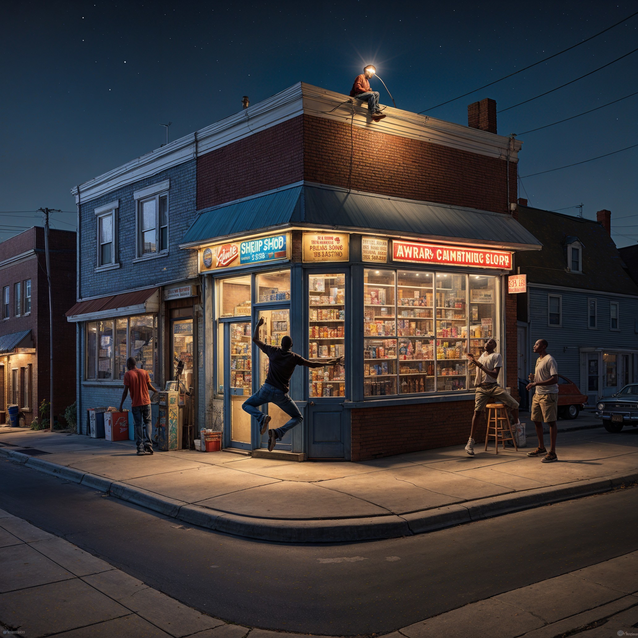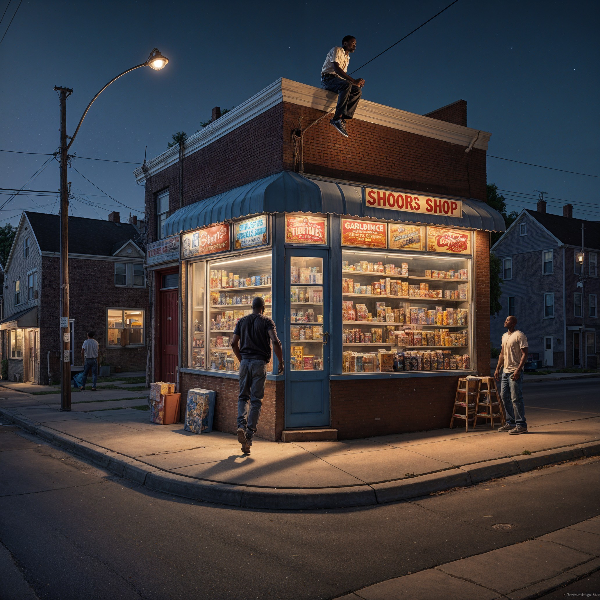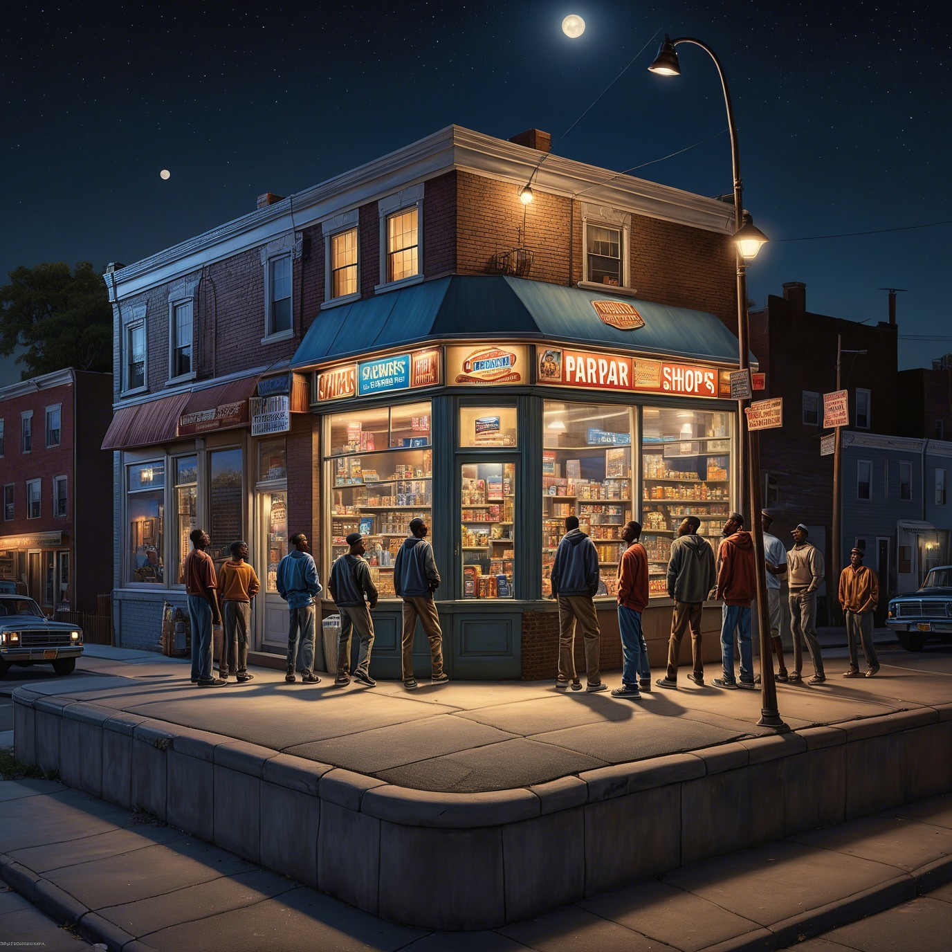 A lone figure stands outside a quaint corner store named "Ernie Barips Chietto Shiep," brightly lit at night. The shop window displays an array of snacks and beverages, inviting passersby.