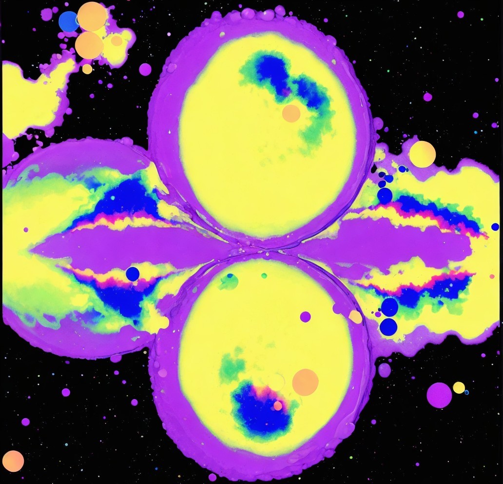 The image features vibrant spheres with yellow and purple hues, set against a starry cosmic background. Swirls of blue and green add depth, suggesting a dynamic and otherworldly scene. Fermi Bubbles are Dark Matter Gamma Rays