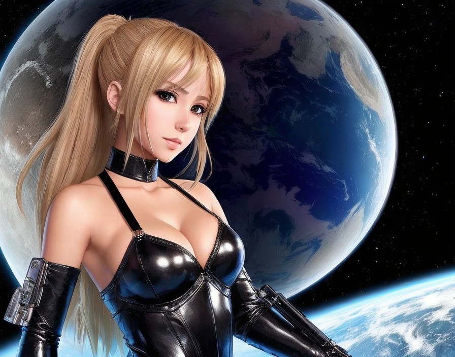 An anime-style female character with blonde hair, in futuristic attire, against a backdrop of Earth from space.