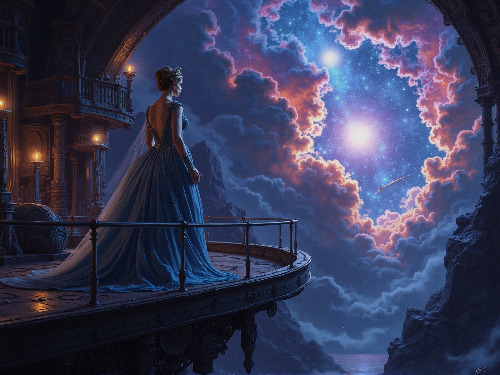 A young woman wearing a detailed teal gown with a low back and a delicate train stands on a gothic style balcony, adorned with a small golden crown on her head and an ornate bracelet on her left wrist. She is looking out at a fantastical night sky, filled with glowing stars and nebulae in shades