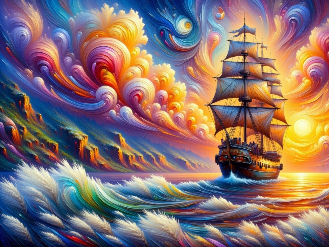 A vibrant, swirling seascape features a classic tall ship sailing through colorful waves against a dramatic sunset, with rich hues of orange, blue, and purple illuminating the sky.