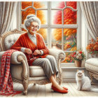 A cozy scene featuring a stylish elderly woman in a red cardigan and glasses, sitting in a plush armchair by a window adorned with autumn foliage and vibrant flowers.