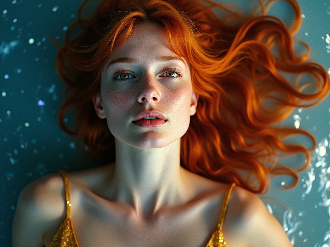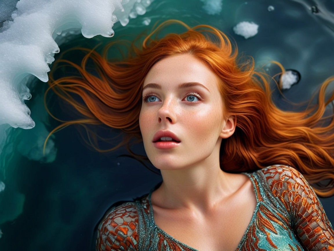 A striking underwater scene features a young woman with flowing red hair and captivating blue eyes. She appears to be emerging from the water, surrounded by swirling waves and light.