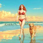 A young girl with long red hair walks along a sunny beach, wearing a red bikini while holding the leash of a golden retriever. The ocean waves splash nearby, creating a cheerful atmosphere.