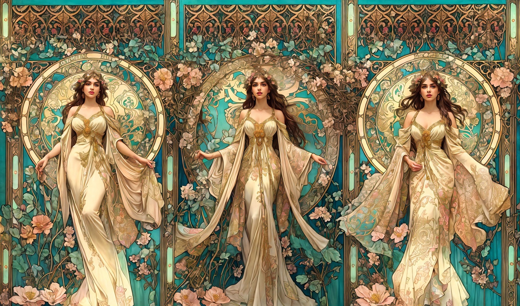 A stunning portrait of 3 women in the style of Alphonse Mucha, adorned in flowing robes and surrounded by intricate floral patterns. The background is filled with ornate details and vibrant colors, creating a sense of Art Nouveau elegance. Rendered in a cinematic film still style, with soft lighting, film grain, and a vignette effect, reminiscent of a live-action movie. The scene exudes a sense of opulence and sophistication. Cinematic film still, shot on v-raptor XL, film grain, vignette, color graded, post-processed, cinematic lighting, 35mm film, live-action, best quality, atmospheric, a masterpiece, epic, stunning, dramatic