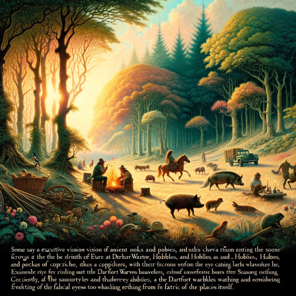 Prompt: "Create an exquisite Forest is a fragment of the ancient wild wood that once stretched the length and breadth of Europe This enchanted forest is like no other: pigs and ponies roam beneath mighty oaks and beeches, and pockets of heath land shelter some of the rarest creatures - including Dartford warblers, hobbies and sand lizards. People live here too - with a unique lifestyle that has survived since medieval times. This episode follows a forest keeper, a coppicer, a storyteller and a farmer as the seasons change, revealing the secrets of an exquisite forest that's as old as England.