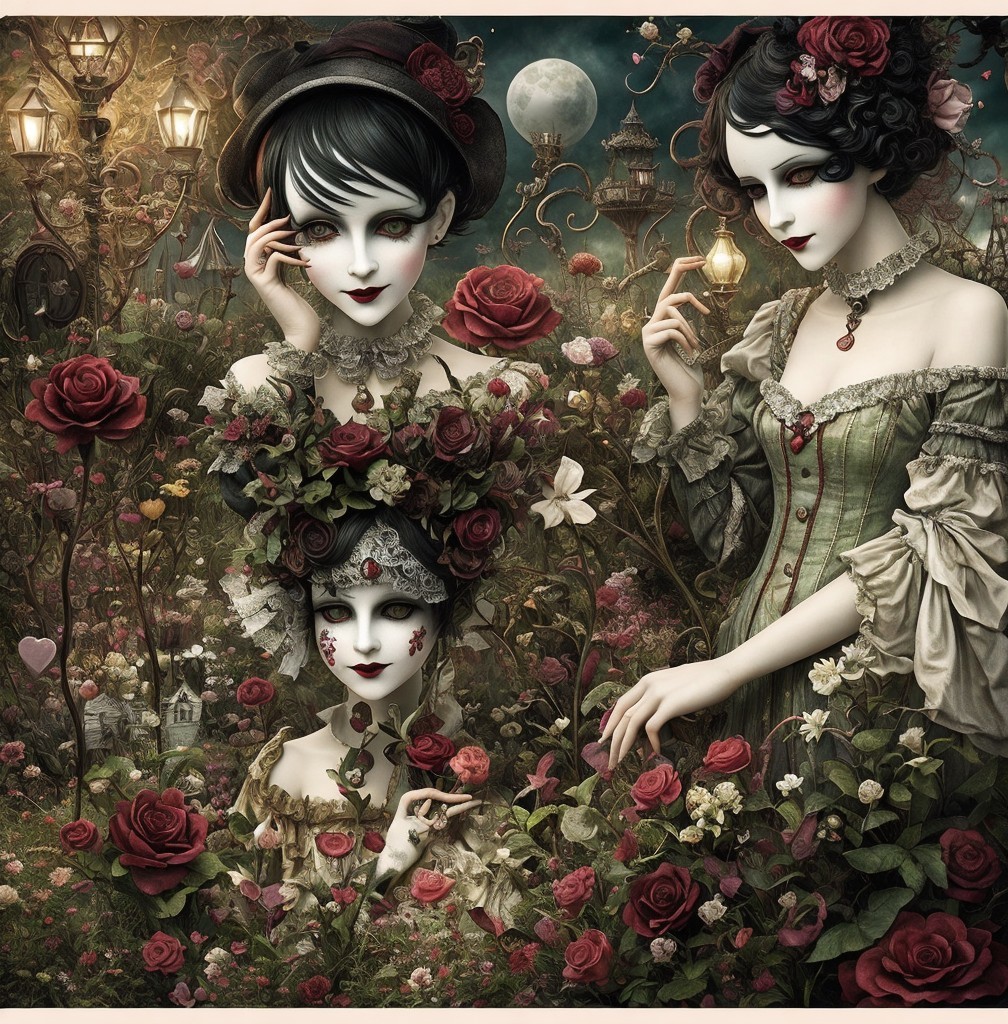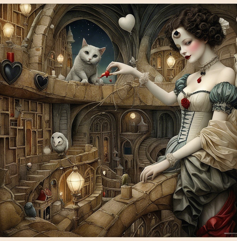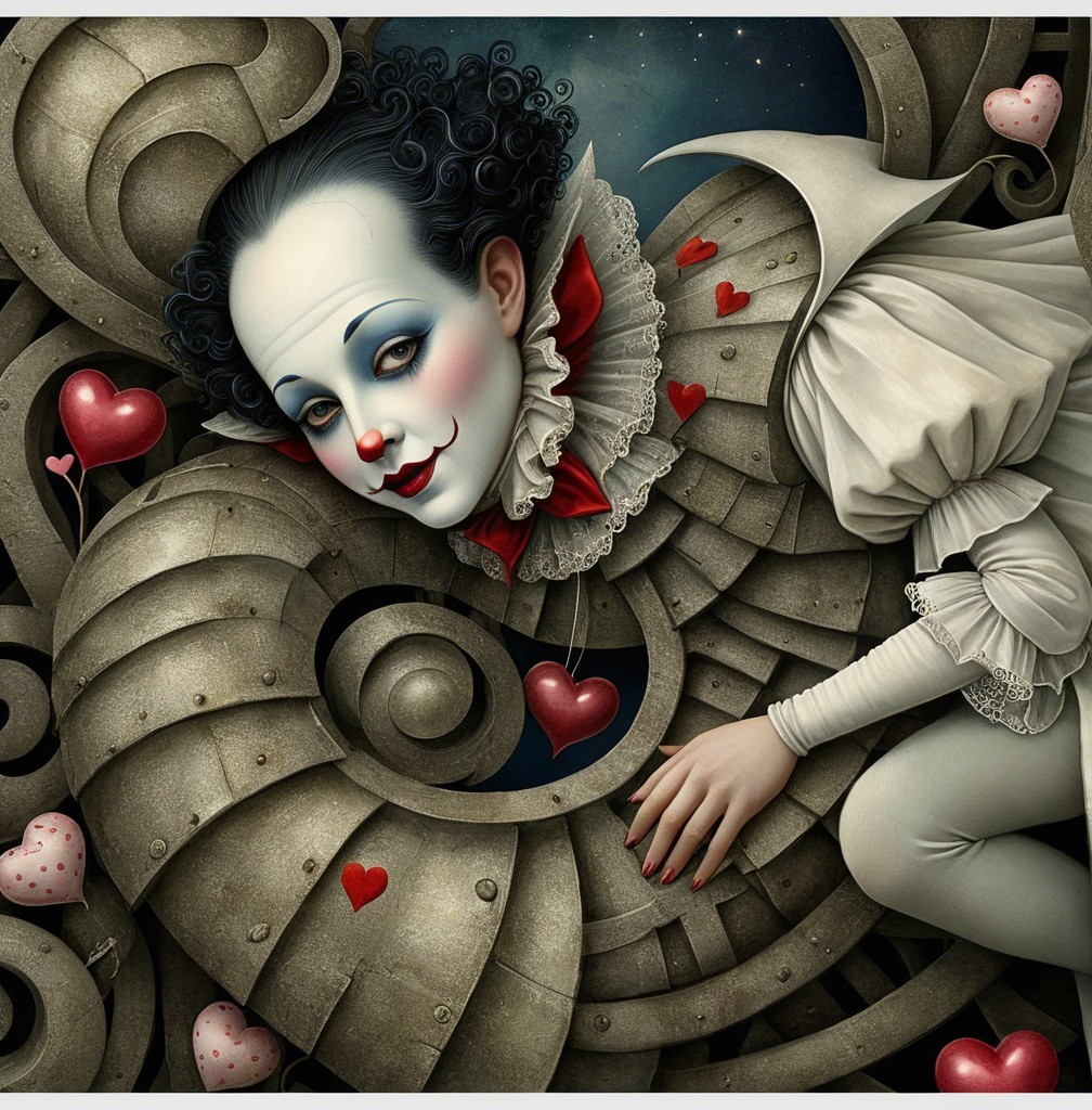 The image features a whimsical, surreal scene with a clown in a ruffled collar and a child-like figure, entwined amid swirling pipes and floating hearts, exuding a dreamlike, artistic vibe.