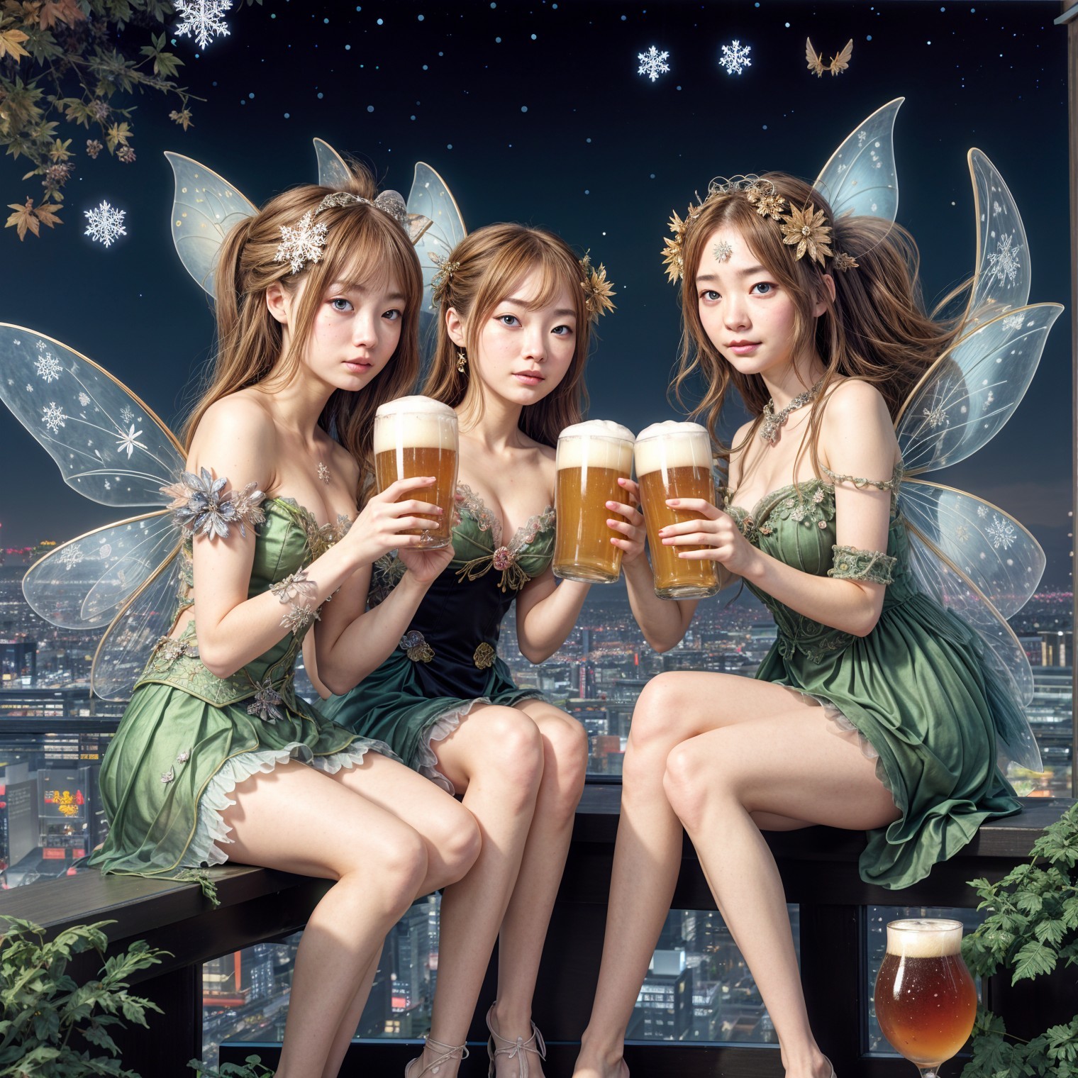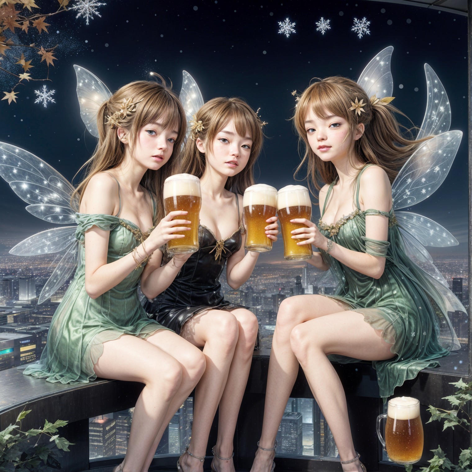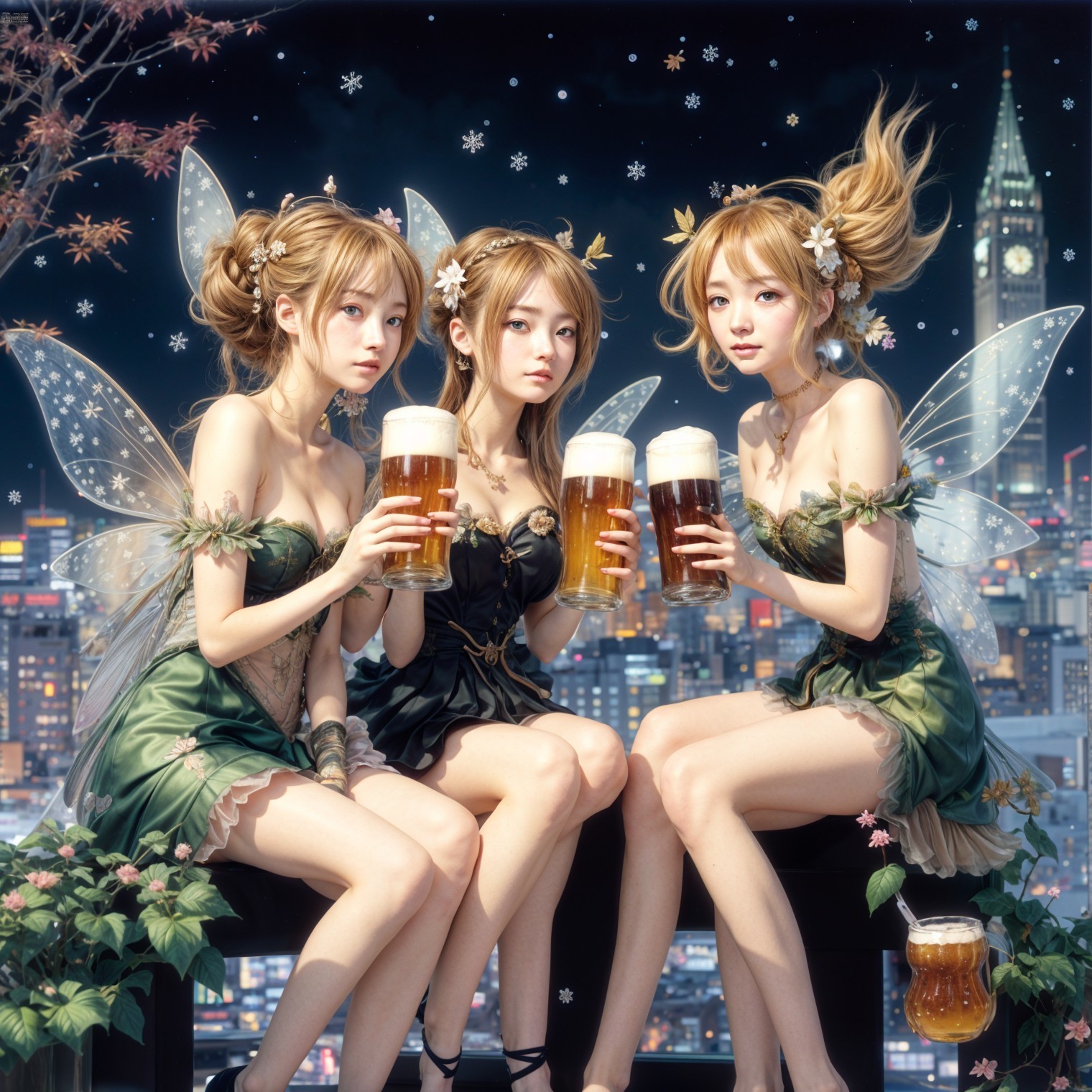 Three fairy-like figures sit together, each holding a pint of beer. They wear elegant, shimmering dresses in green and black, with delicate wings, against a sparkling cityscape backdrop.