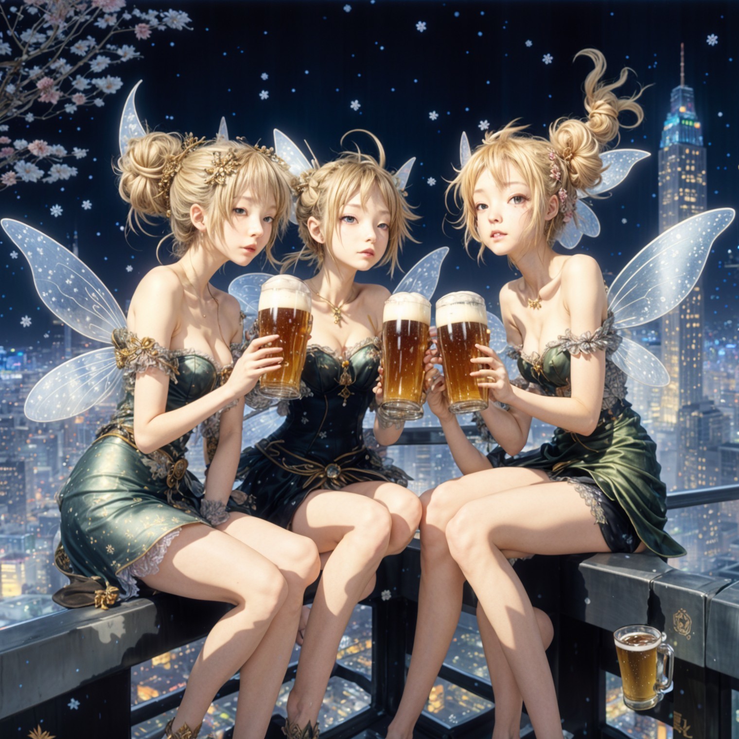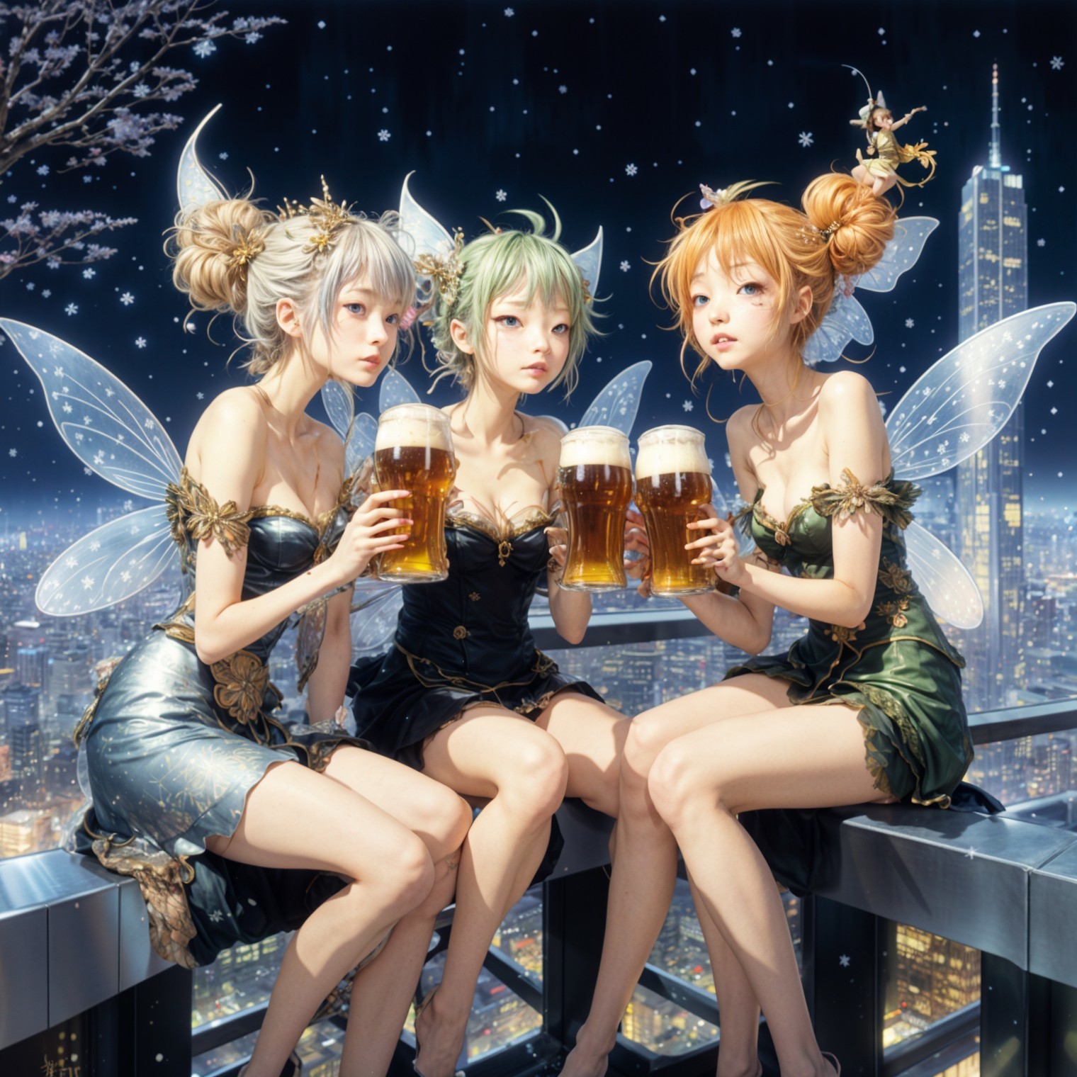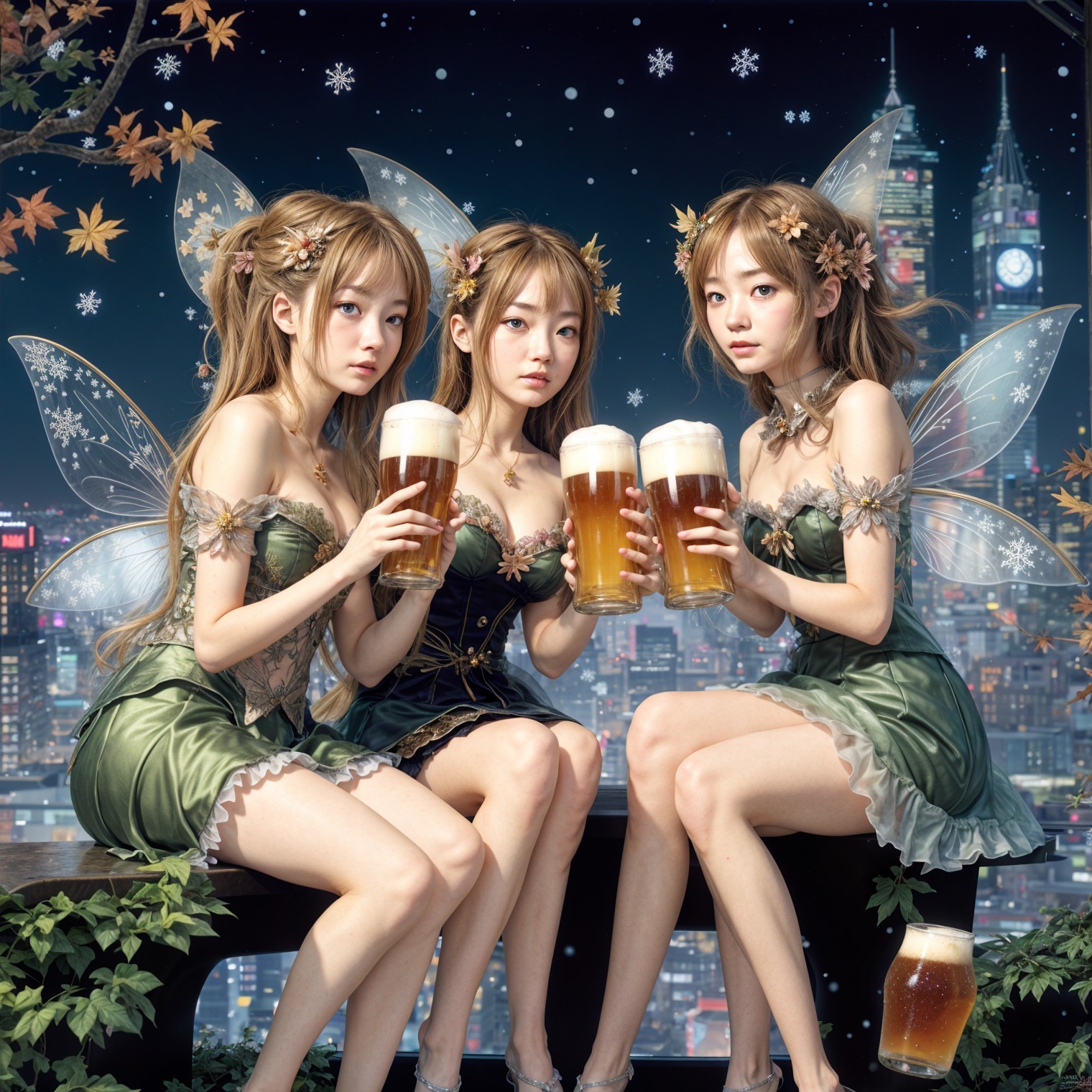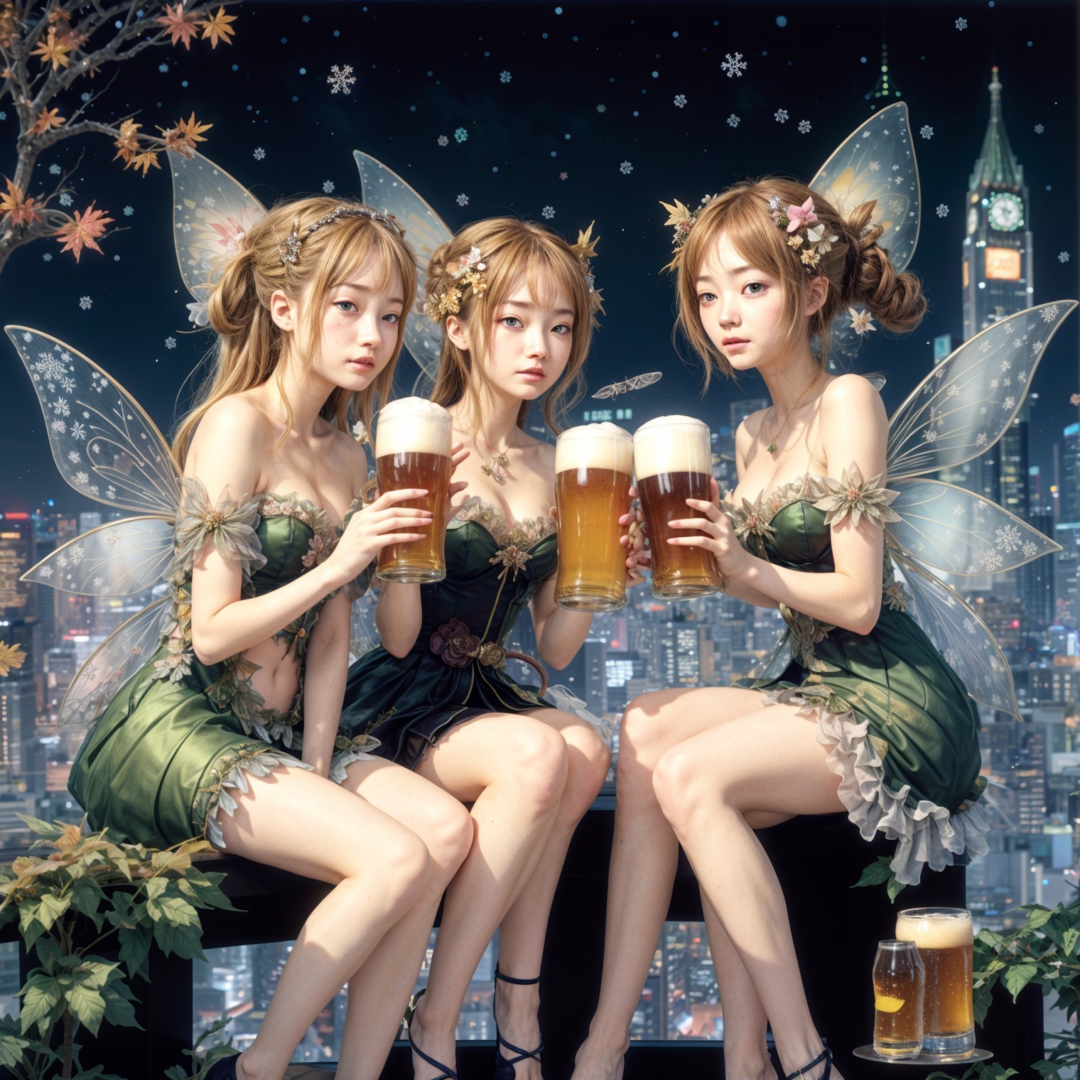 Three fairy-like figures sit together, each holding a pint of beer. They wear elegant, shimmering dresses in green and black, with delicate wings, against a sparkling cityscape backdrop.
