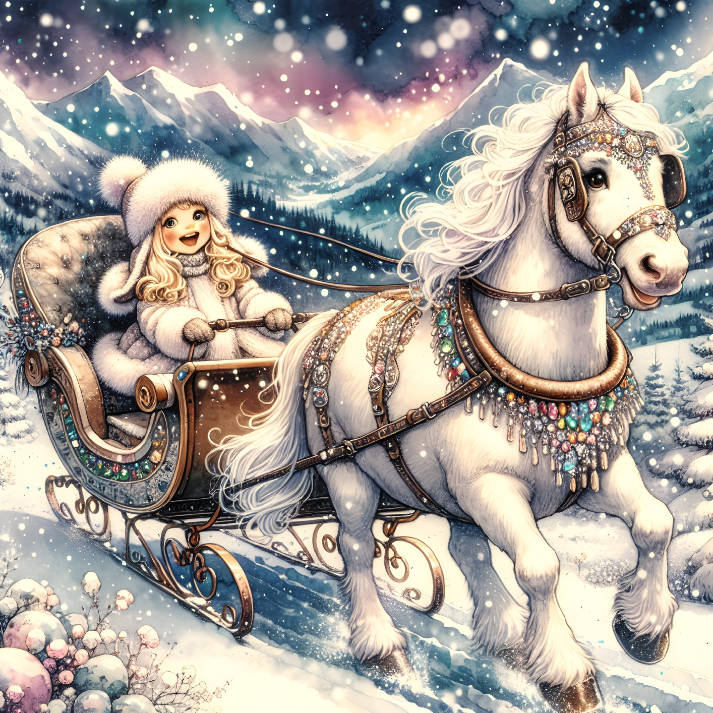 A cheerful girl in a cozy winter outfit rides in an ornate sleigh pulled by a stunning white horse, surrounded by snow-covered mountains and falling snowflakes, creating a magical winter scene.