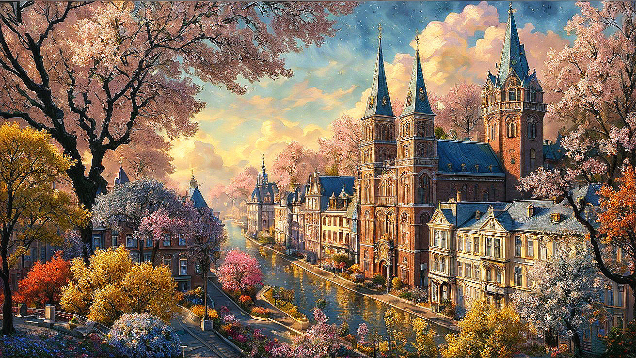 A picturesque street lined with blooming cherry trees and charming buildings under a warm, sunset sky.