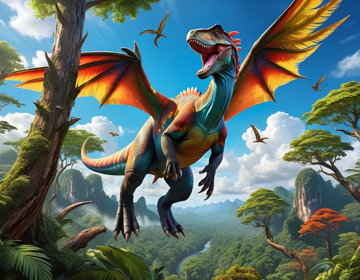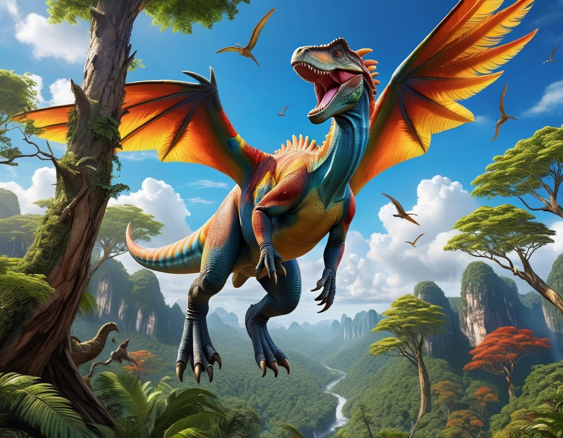 A colorful, winged dinosaur dominates a vibrant prehistoric landscape with a river and other flying creatures in the background.