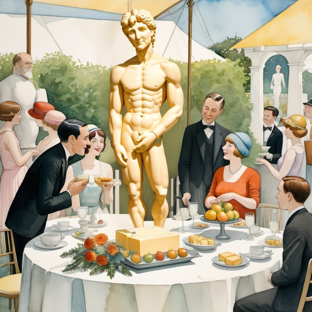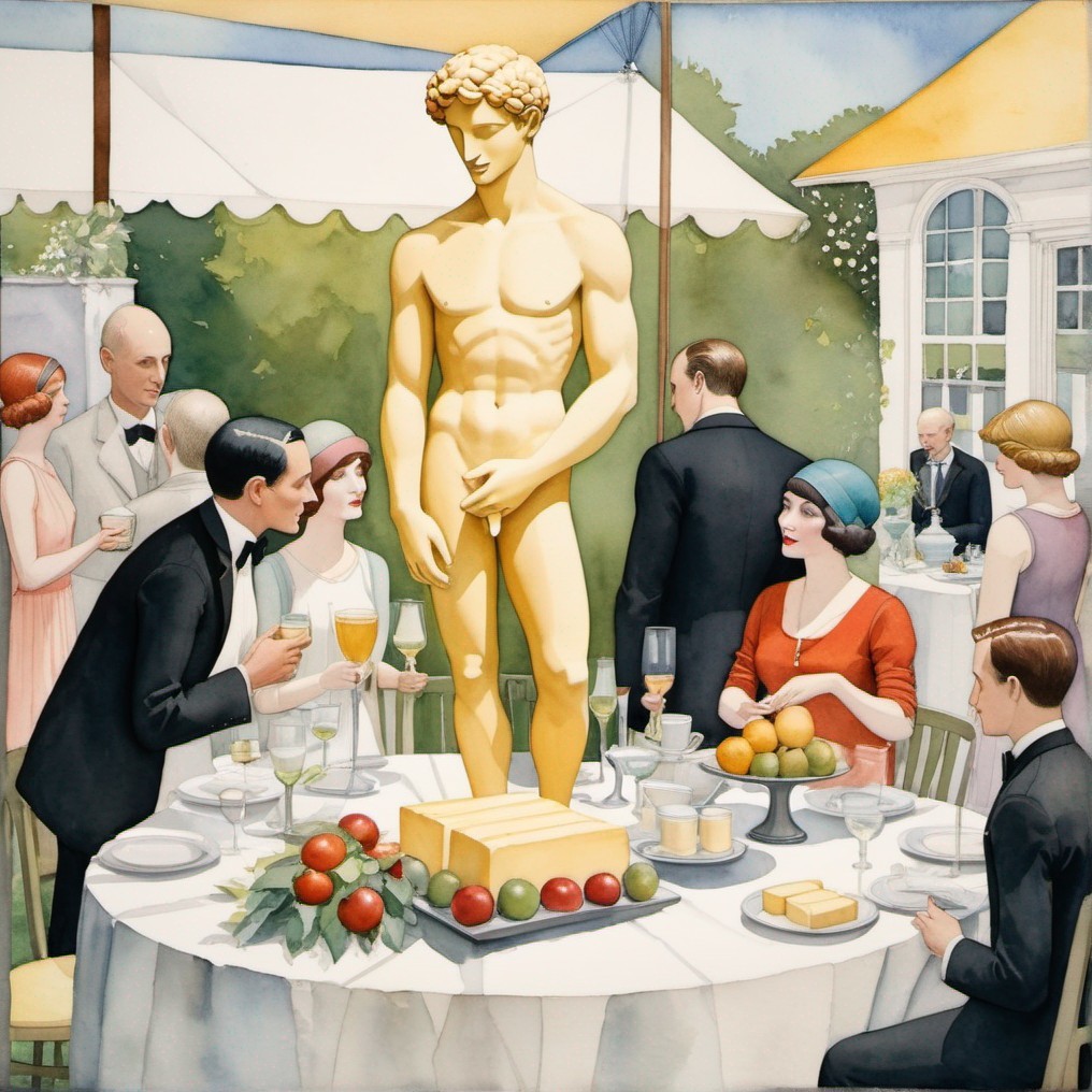 A garden party scene set in the 1920s with guests in formal attire surrounding a table featuring a large butter statue of a somewhat modest David. Person makes a joke to their spouse. People smirk.