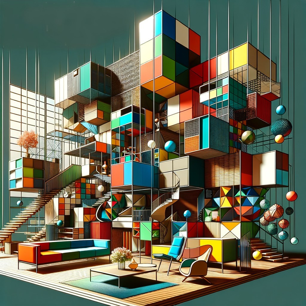 Create an engaging space with functional geometric furniture in vivid hues, inspired by Kandinsky's spatial techniques and Albers' color contrasts. The design balances practicality with beauty, boasting elegance, intricacy, and vibrant aesthetics.