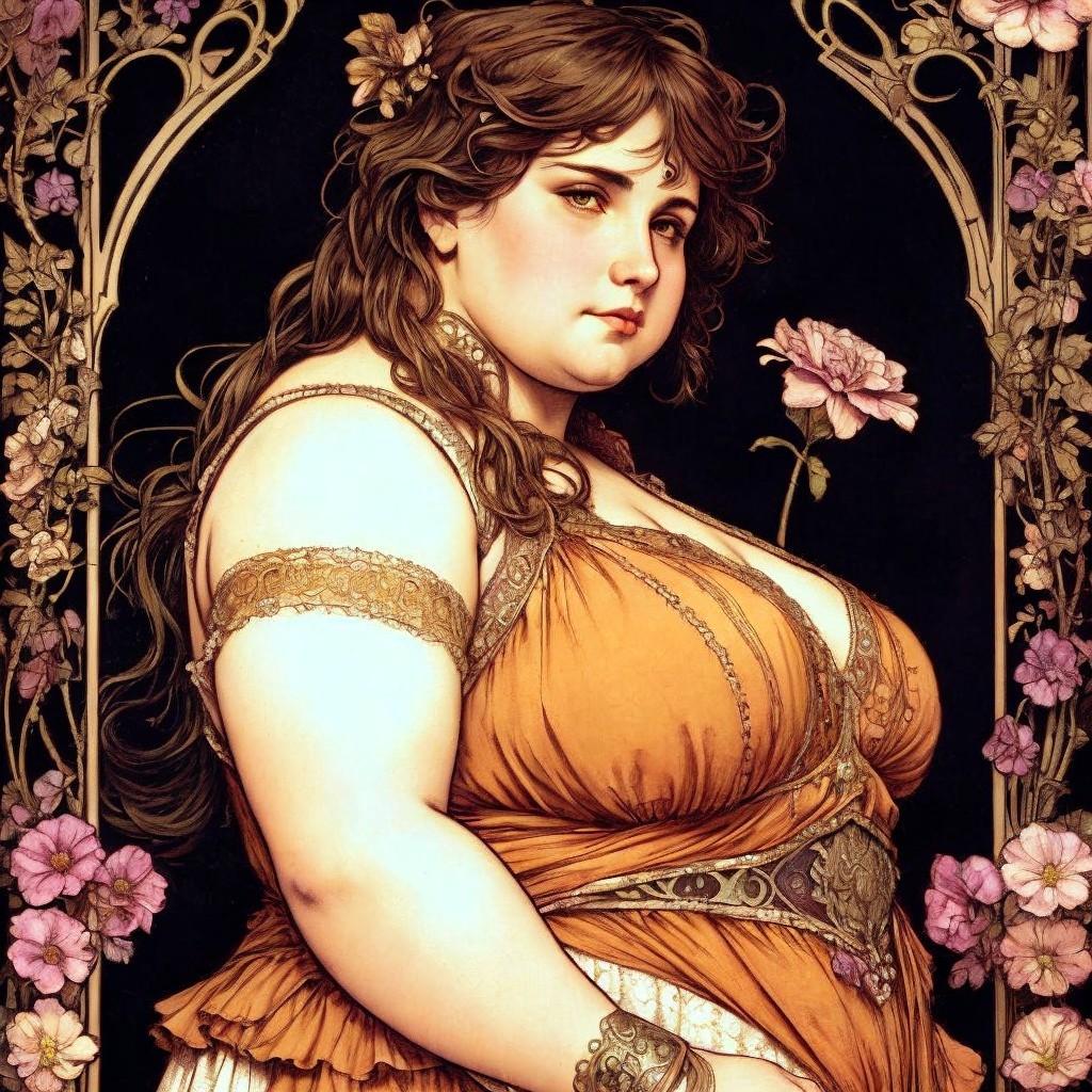 A voluptuous woman stands gracefully, wearing a flowing golden dress adorned with lace. She holds a pink rose, surrounded by intricate floral designs that enhance her beauty.