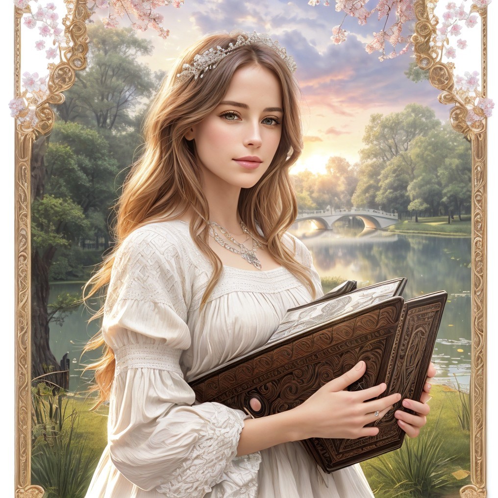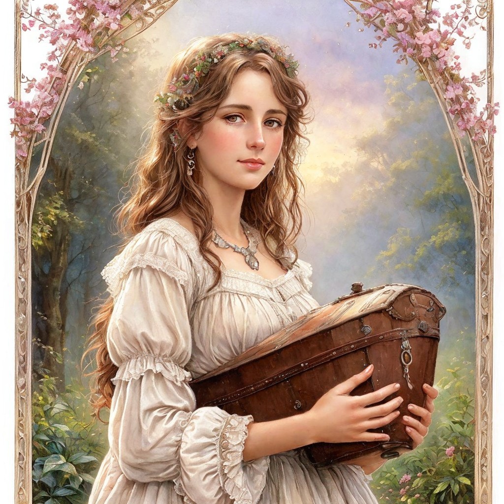 A majestic woman in a flowing white gown, adorned with a crown and necklace, holds two ravens, set against a dramatic mountainous backdrop with clouds. The scene exudes mystery and elegance.