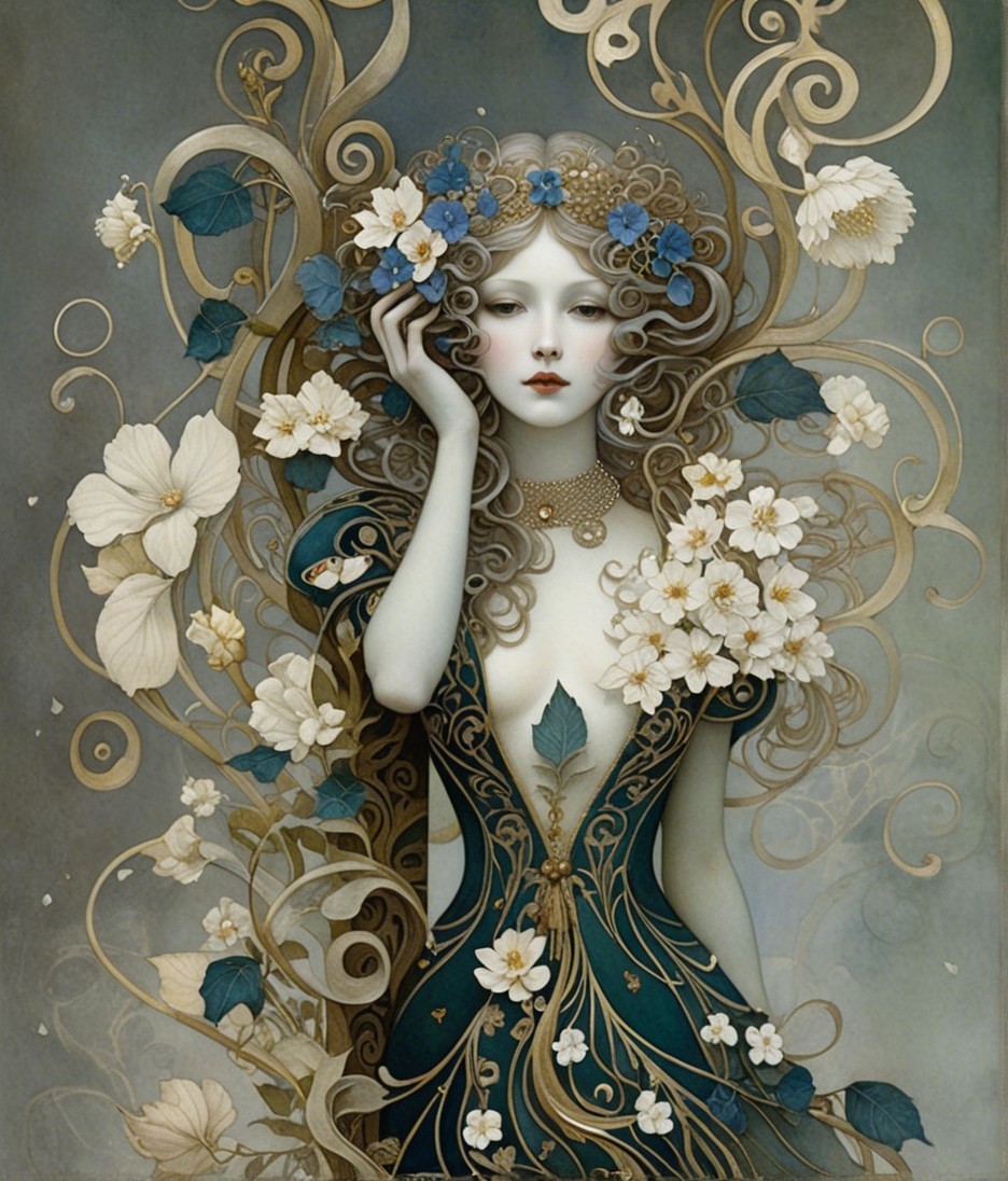 The artwork features an elegant woman with flowing hair, adorned in a detailed, dark gown. She wears a crown of jewels and is surrounded by intricate floral motifs, exuding a mystical aura.