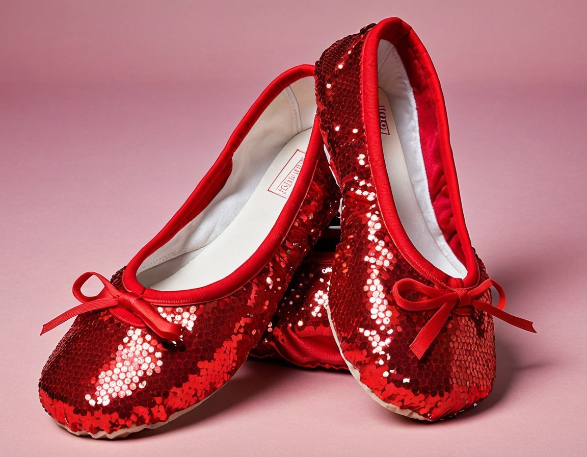 A pair of vibrant red ballet flats adorned with shimmering sequins, featuring a classic rounded toe and delicate bow on each shoe. Set against a soft pink background, they exude charm and elegance.
