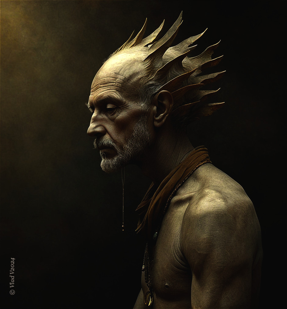 A striking profile of an elderly man with elaborate spiked hair, showcasing a weathered face and intricate details. His muscular bare torso and unique adornments suggest a compelling story.