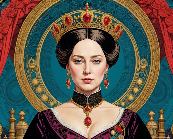 A young woman with long, dark hair styled elegantly, adorned with a jewelled tiara and pearl necklace. She gazes serenely against a backdrop of blue sky and soft clouds.
