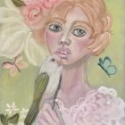 A surreal portrait of a woman with wavy, light hair and an ethereal expression. Her fragmented skin texture blends with a dreamy background, while a colorful hummingbird flits nearby. Original Prompt: Susanne