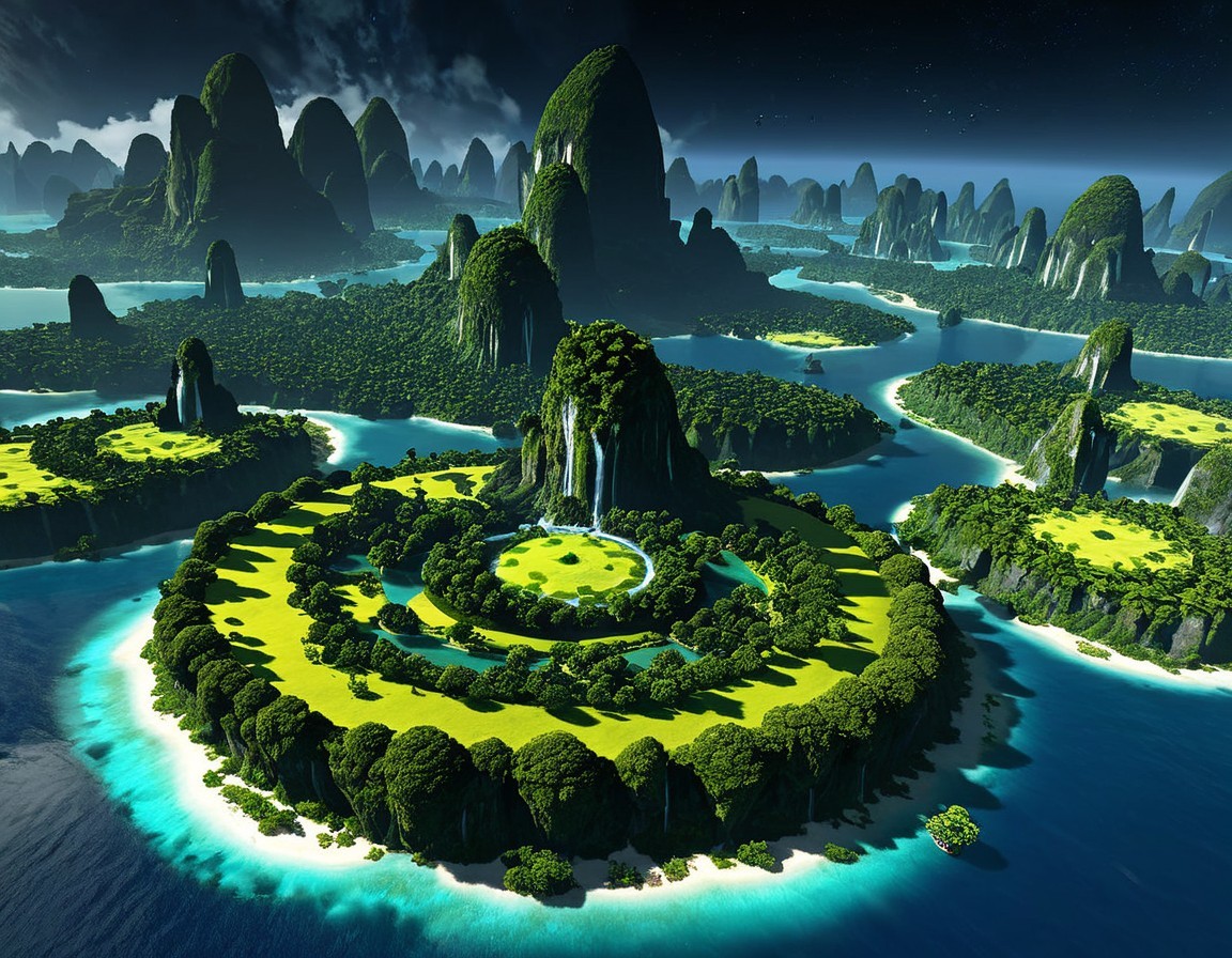 A stunning fantasy landscape featuring lush green islands with towering mountains, cascading waterfalls, and vibrant blue waters, all set against a dramatic starry sky.