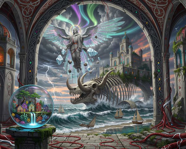 Prompt: ((A masterpiece of unparalleled excellence)), ((Create a Amazing image)), (("A vast cinematic landscape where a colossal futuristic spacecraft rests on icy terrain during a raging snowstorm, its illuminated windows glowing against the blizzard. In the foreground, human figures trek across the frozen ground toward the towering structure, dwarfed by its immense landing gear. Beyond the storm, a surreal forest emerges: twisted roots and branches form a wall containing a glowing red portal. From the portal, three towering bird-headed figures in tattered robes step forward, their decayed forms radiating ominous energy. A lone cloaked traveler stands between the spacecraft and the portal, caught between advanced technology and ancient mysticism. Jagged rocks, spire-like formations, and turbulent waves frame the horizon under a dramatic sky of swirling clouds and ethereal light. The composition fuses science fiction grandeur with dark fantasy surrealism, rendered in ultra-detailed 8K HDR with cinematic realism and atmospheric depth)), (Detailed and intricate artwork that blends elements of fantasy, surrealism, and futuristic themes. The piece should evoke a sense of wonder and awe, Utilizing techniques reminiscent of Amazing Ultra detailed digital painting, Patchwork-style of Tomasz Setowski, Jean-Baptiste Monge and Hayao Miyazaki. As create by Hundertwasser, Zdzislaw Beksinski, Arthur Rackham, Paul Klee, Hayao Miyazaki and Josephine Wall). (Full-size Image, No text).