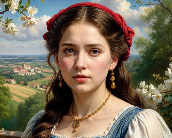 A young woman with long braided hair and rosy cheeks, dressed in a rustic blouse, gazes thoughtfully into the distance. Lush green fields and quaint cottages create a serene backdrop.