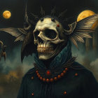 The image features a haunting skull adorned with feathers and gemstones, surrounded by dark, cloud-like smoke. Two moons hover in the background, adding an eerie ambiance to the scene. A blend of horror aesthetics with oil painting in the style of the old masters
