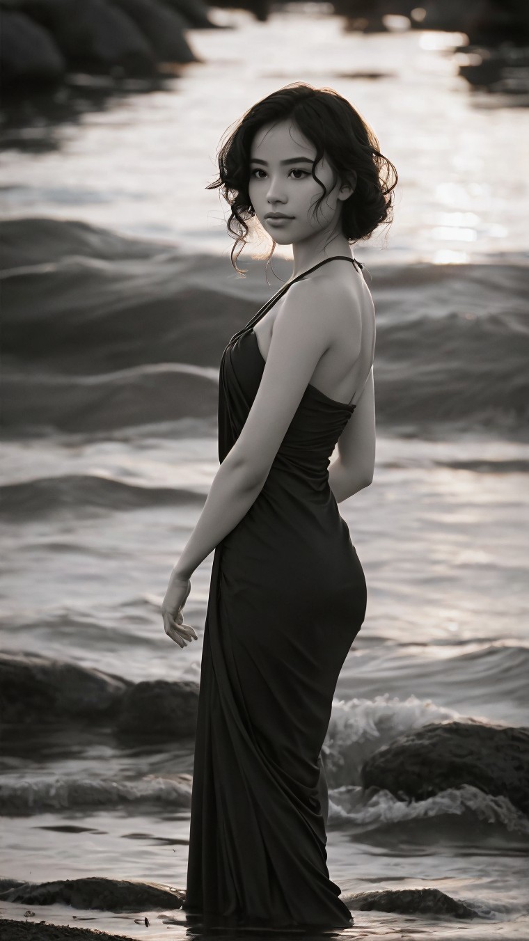 + Prompt:A silhouette of a figure stands at the water's edge during dawn. The figure is tastefully draped in flowing fabrics that catch the gentle morning
