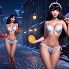 Stylized Characters in Golden Bikinis with Urban Backdrop