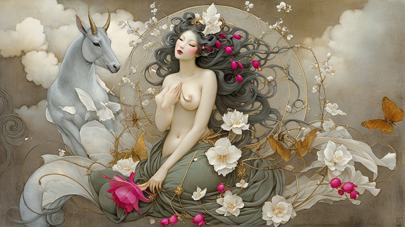Nymph of the night is dark and full of beautiful magic. She had been born with a face that would let her get her way Big,, in the style of Michael Parkes. Medieval Japanese Artists Sumi-e Style, fuschia , grey-green, bronze, Velvet Black, Shabby, Dull Gold, Amber Gray, Golden Ratio, Surreal Fantasy, Elegant, High Definition Ultra Fine 3D Line, Zenangle Style, Watercolor Patchwork , Arthur Rackham Style, Paul Kidby, , Jacek yerka, Extremely Detailed, Intricate, Thoughtful, HDR, Fractal, Beautiful, Award Winning, Fantasy Look, Fantasy, Crisp Quality