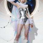 A heroic character stands confidently in a striking golden costume, complete with a flowing white cape. The backdrop features a futuristic circular window, enhancing the dynamic pose.