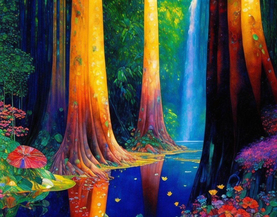 3D watercolor, fantastic Wide view, in the very best style of Gustav Klimt, a spectacular sunrise reflected in a beautiful rainforest river, satiny, high quality, shimmering, with vibrant saturated colors, elegant, highly detailed, glistening magic style, by Alphonse Mucha