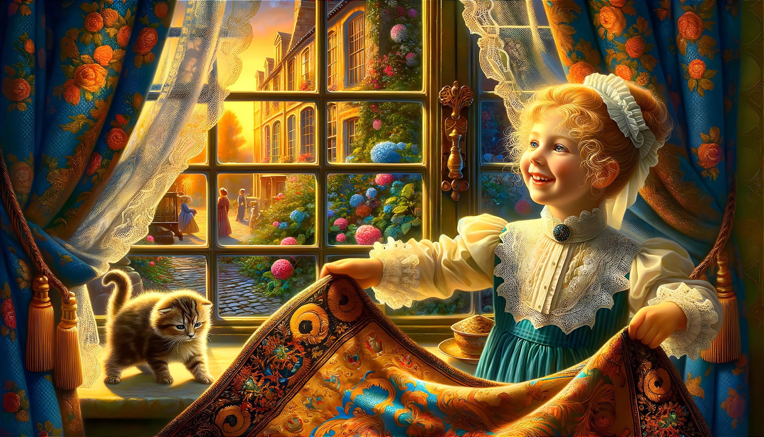 A detailed and enchanting painting depicts a young Victorian girl joyfully shaking a textured bedspread out of a window, accompanied by her kitten. The scene exudes nostalgia with intricate details of Victorian attire and setting, bathed in warm sunlight, creating a serene and charming atmosphere.