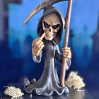 A detailed figure of a skeletal Grim Reaper draped in a dark hooded cloak, holding a scythe. The background features a starry night sky with a hint of mountainous terrain.
